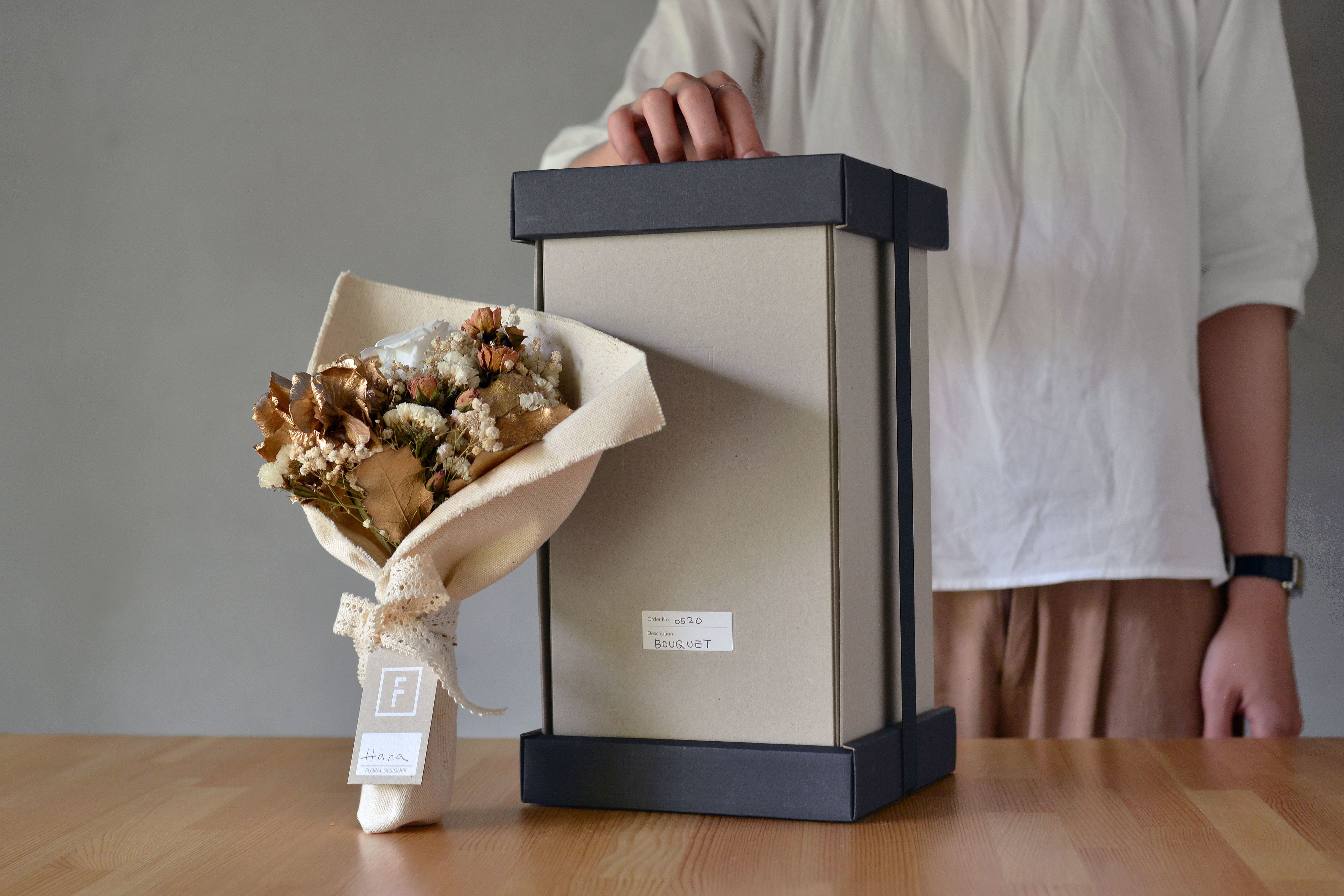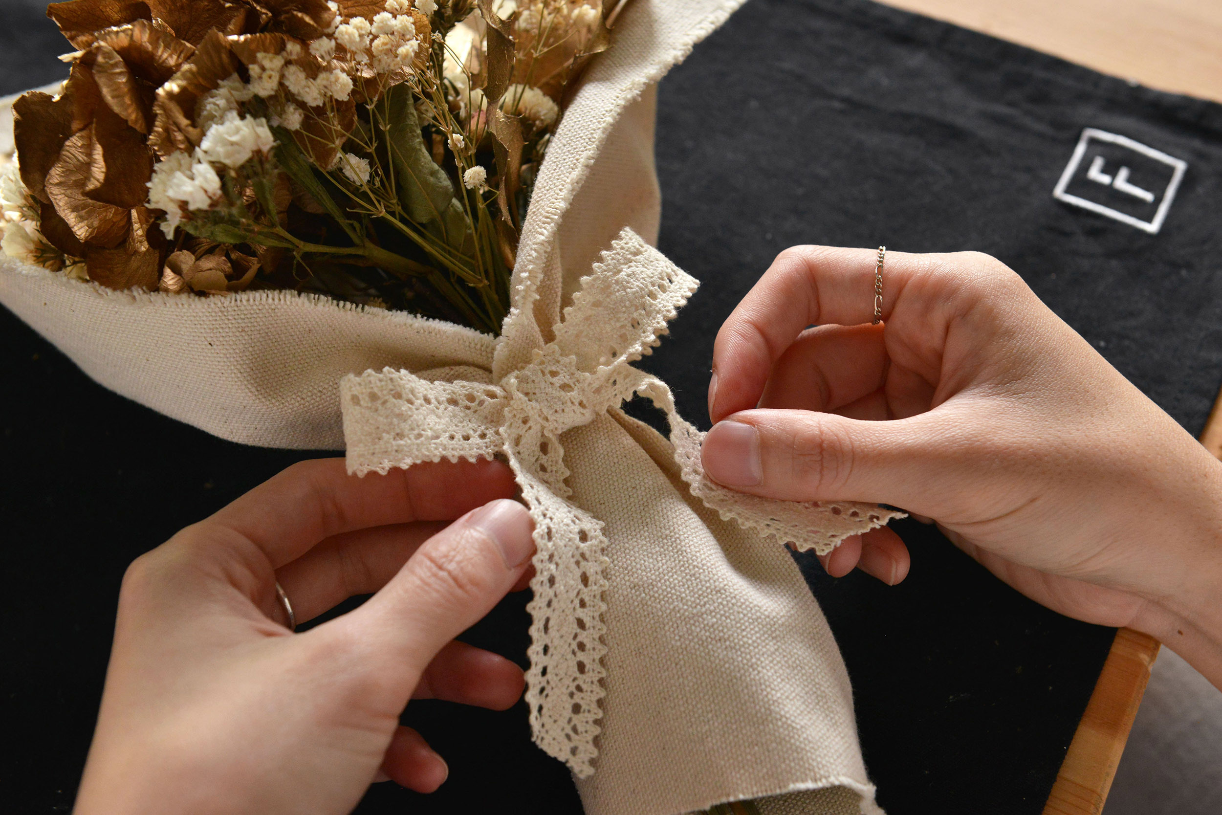 以乾燥與永生花來說,存放時間很長,耐用的布品包裝更為合適,花裡經選厚實的帆布,呈現精緻的手作感。