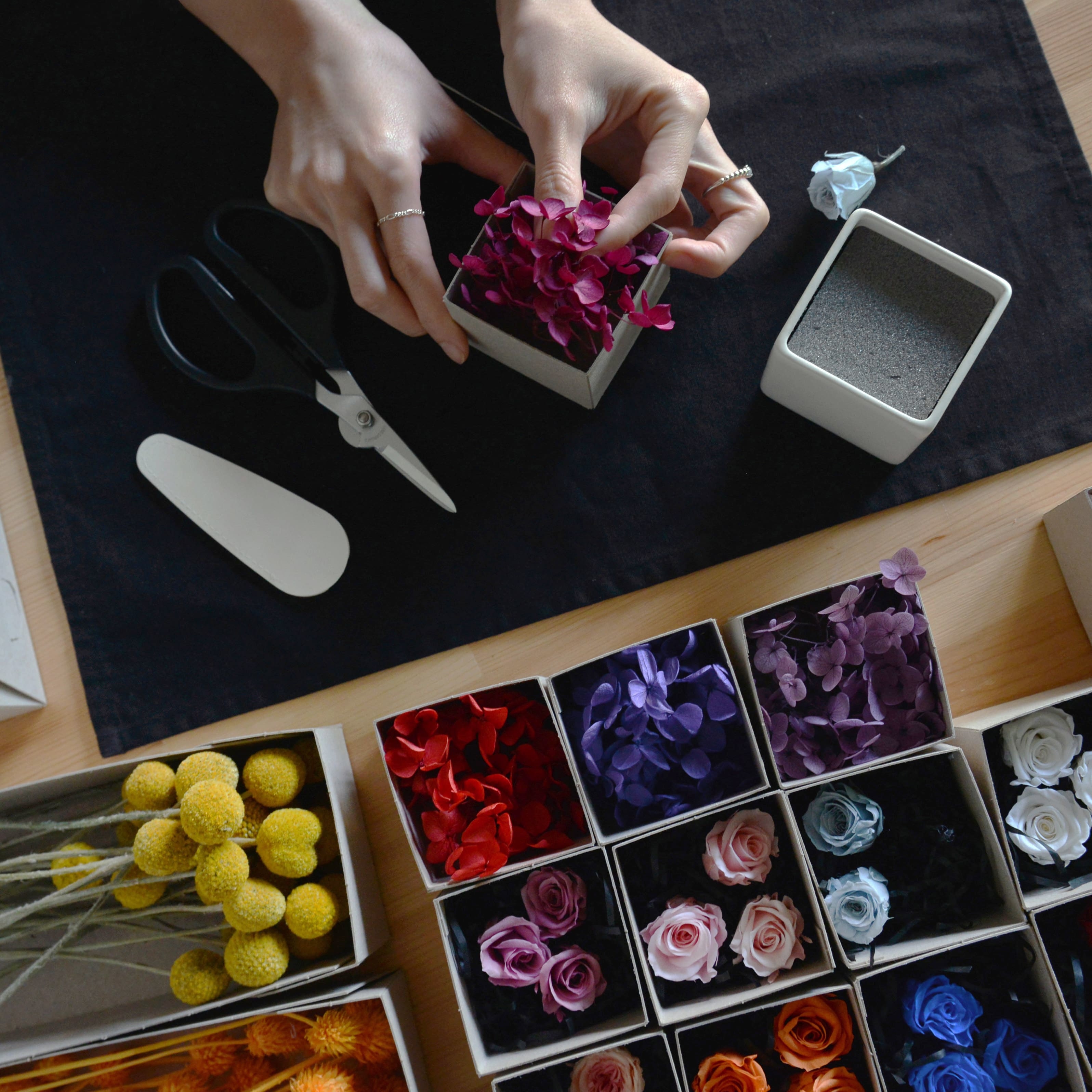 從永生花到乾燥花,再從花型到各樣顏色,老師會引導你選擇可搭配的素材,你可以在這裡創作專屬的花束。