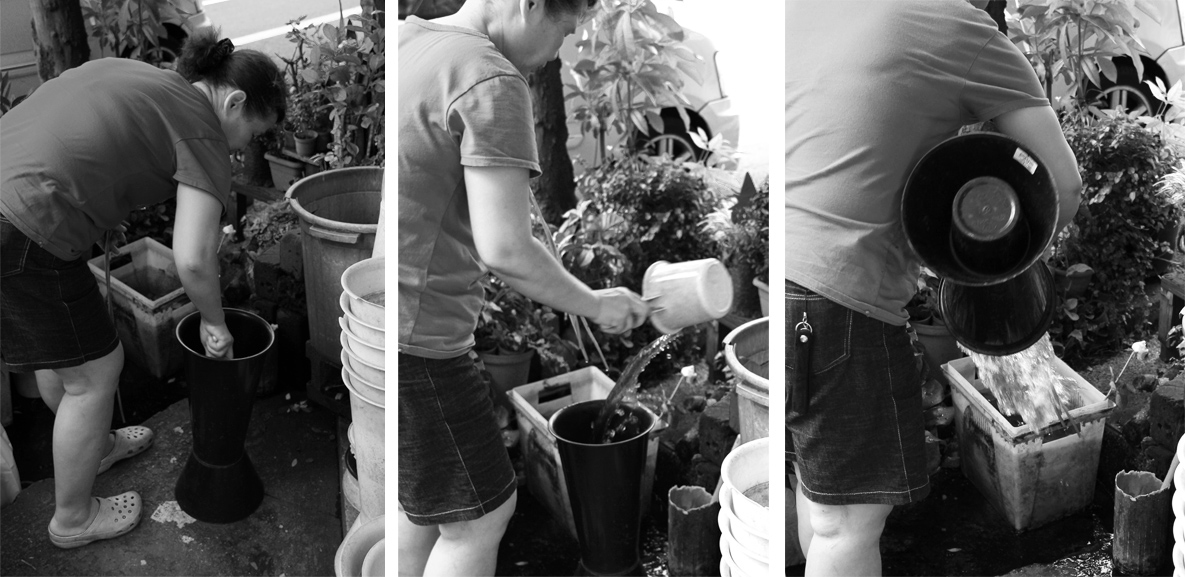 我並不是偶然發現這些事情,源自於大學時有一門「通用設計」課程,我還記得那一周的作業是觀察生活中的問題,過程中不知不覺養成了尋找「問題」的習慣,使我待在花店時也不自覺的觀察起周遭事物,這時候才發現,讓母親最辛苦的莫過於開店的換水工作,她每天替每桶鮮花替換乾淨的水,換水時需經歷彎腰、提桶、傾倒、刷洗、重新注水、彎腰等等的重複動作,這些動作都會使用膝蓋,看起來都十分緩慢與痛苦。看著這辛苦的過程,不禁想:「我能夠做些什麼呢?」