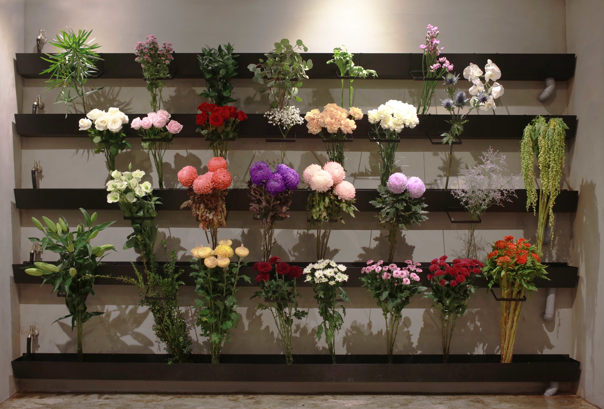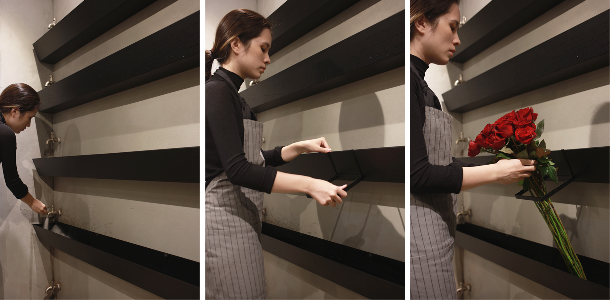 藉著店面重新規劃的機會,將所有花用水源整合成幾個長型渠道,水槽的一邊可開啟水龍頭,另一邊則有水塞可排水放水,簡化了繁雜的換水工作。