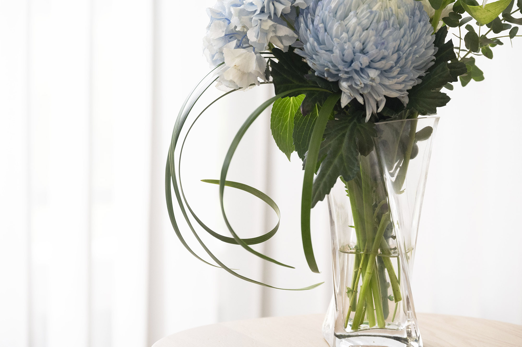 為客廳打造一份清涼風格的花藝作品,運用線條葉材增添作品動感,並透過細口花瓶的比例調節以適應不同視角。大塊花材則在視覺上創造焦點,完美點亮空間。