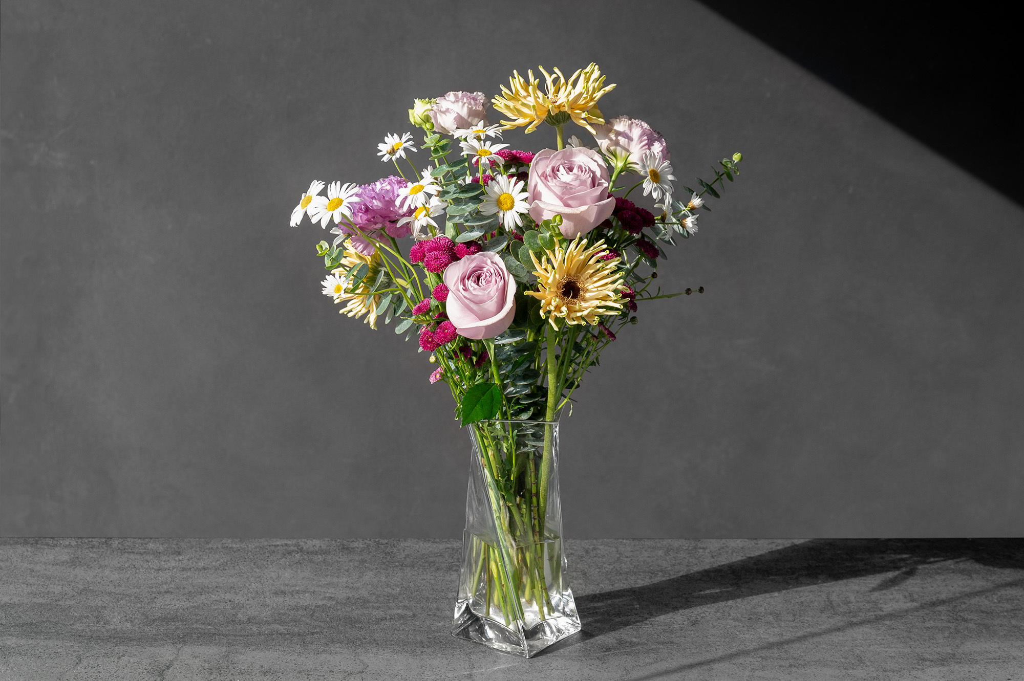 玫瑰與捲邊太陽花柔和對比,