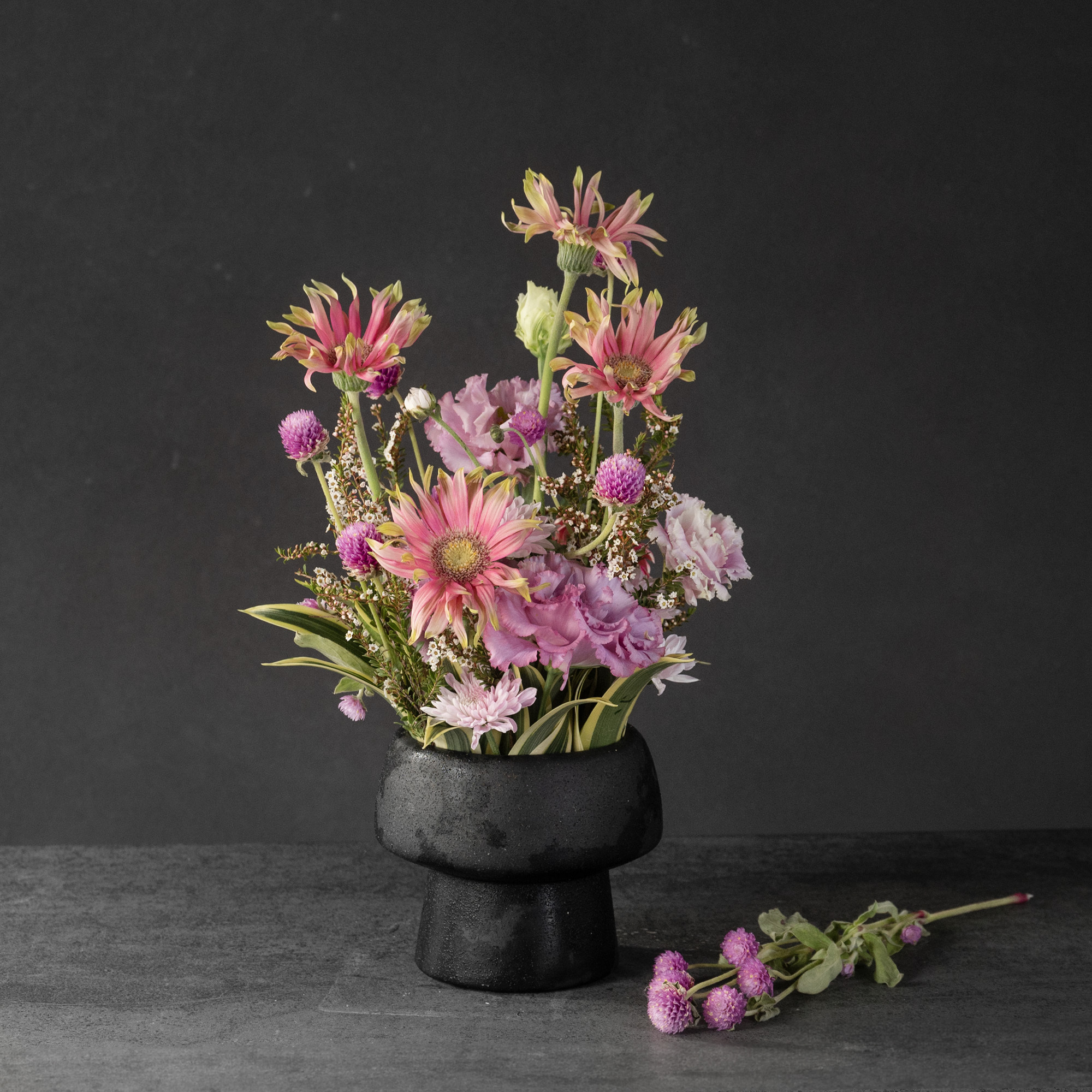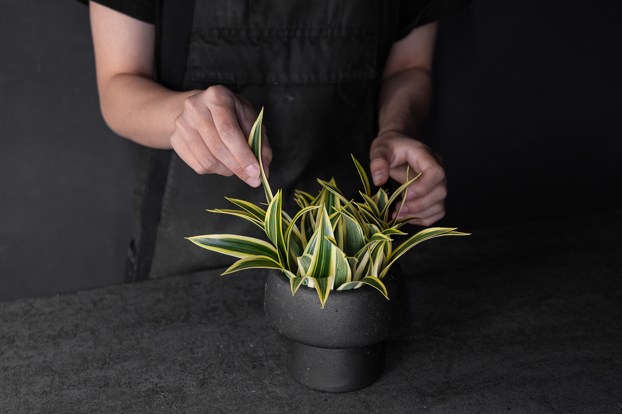 黑色瓶器加上百合竹葉材架構,使花材更加顯色,