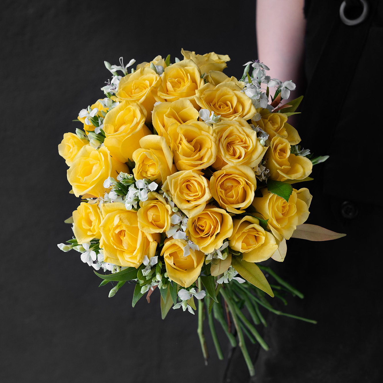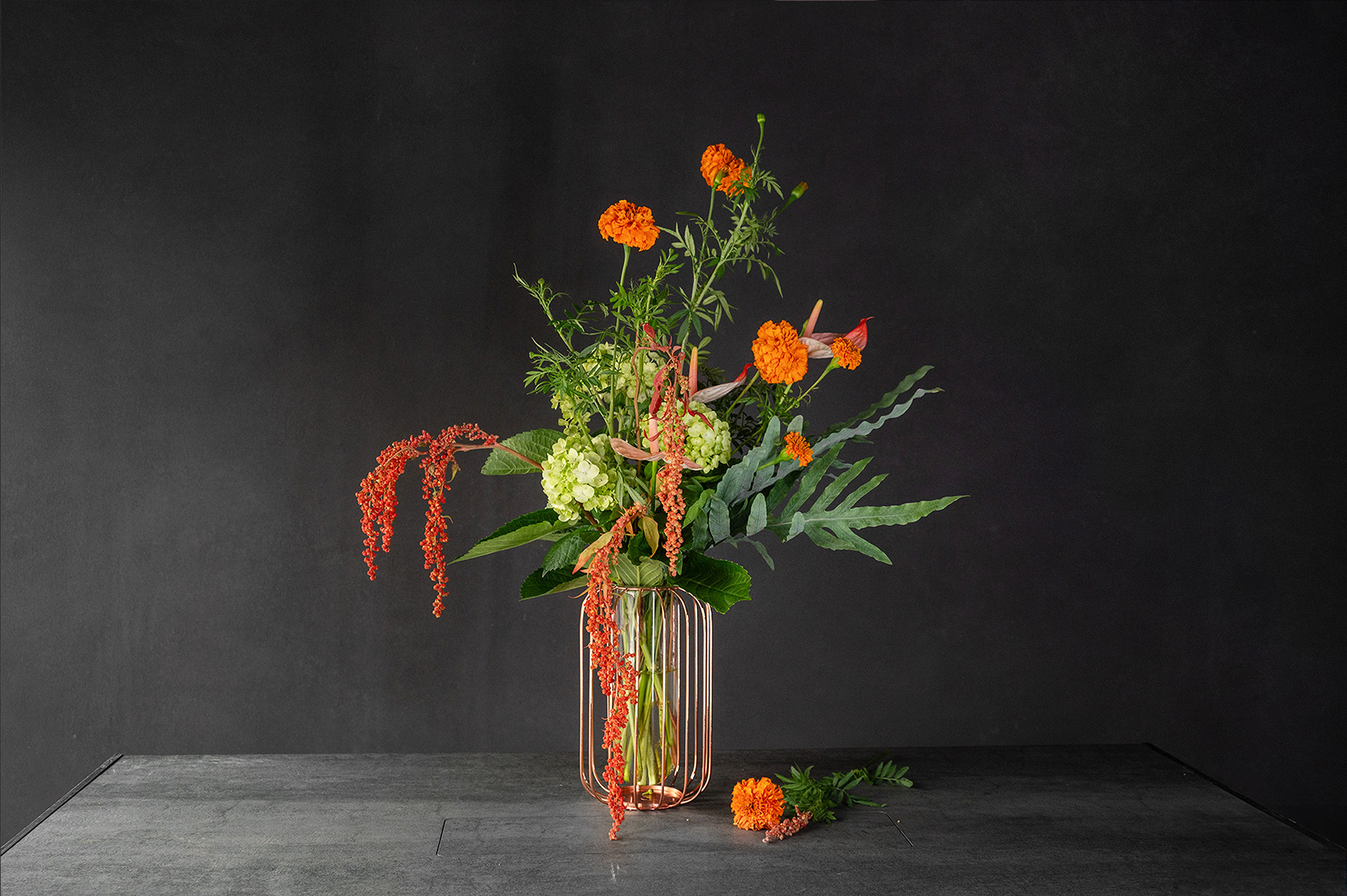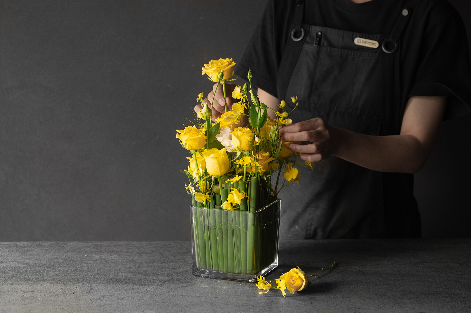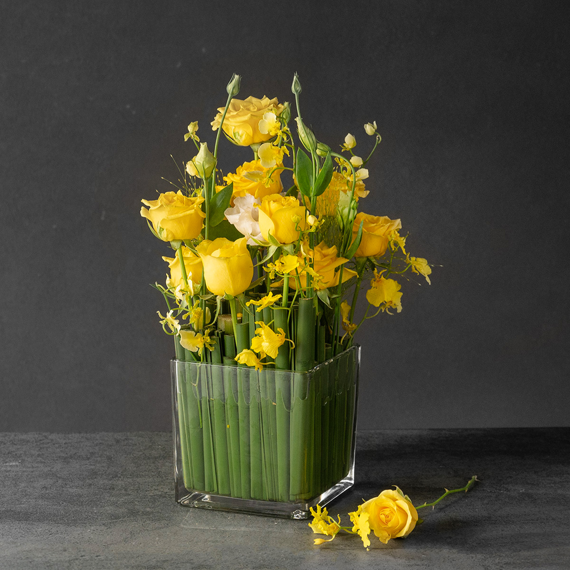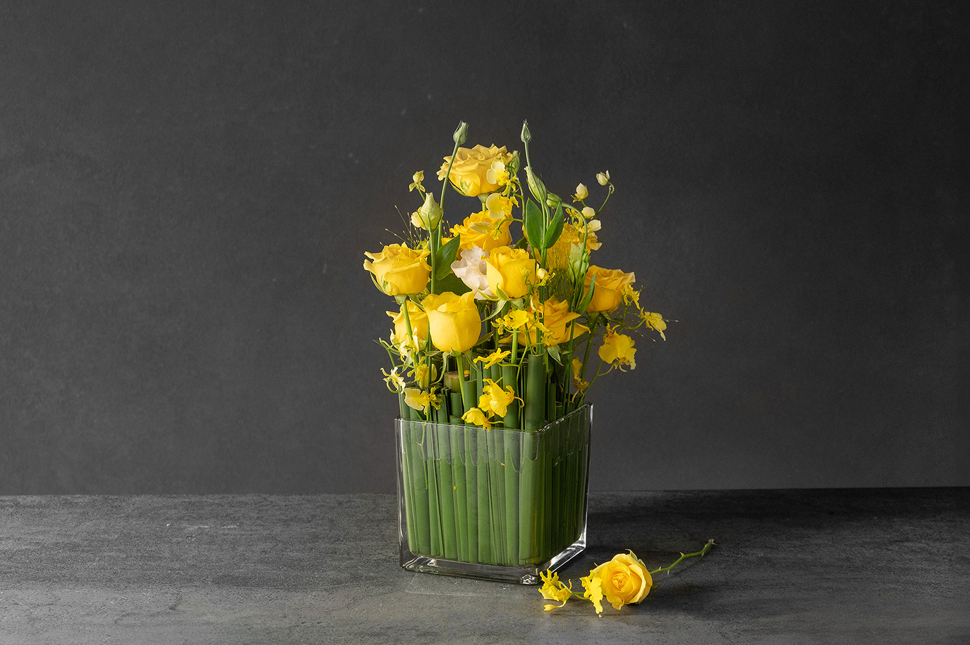 搭配黃玫瑰以及文心蘭,提高作品的亮眼程度,
