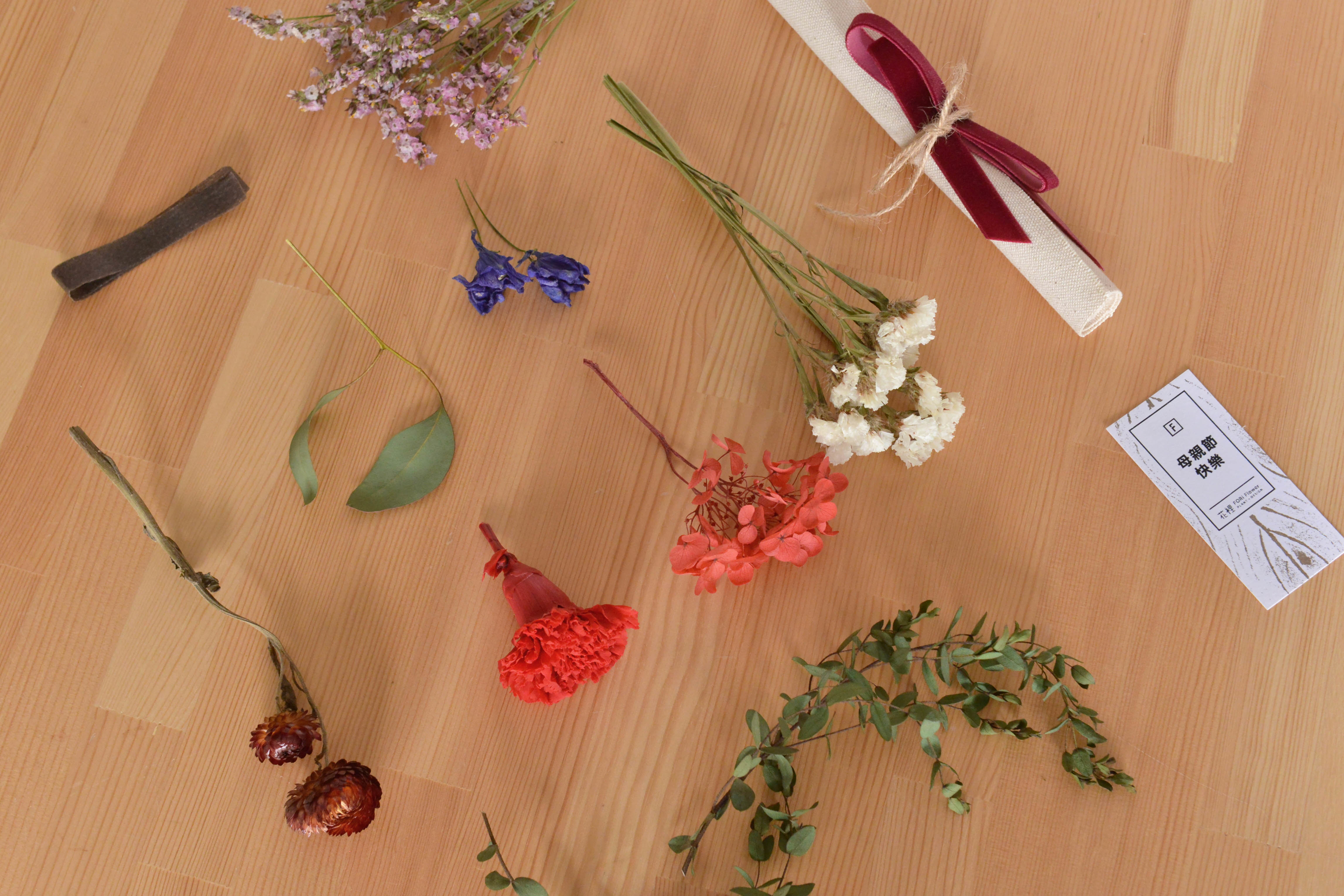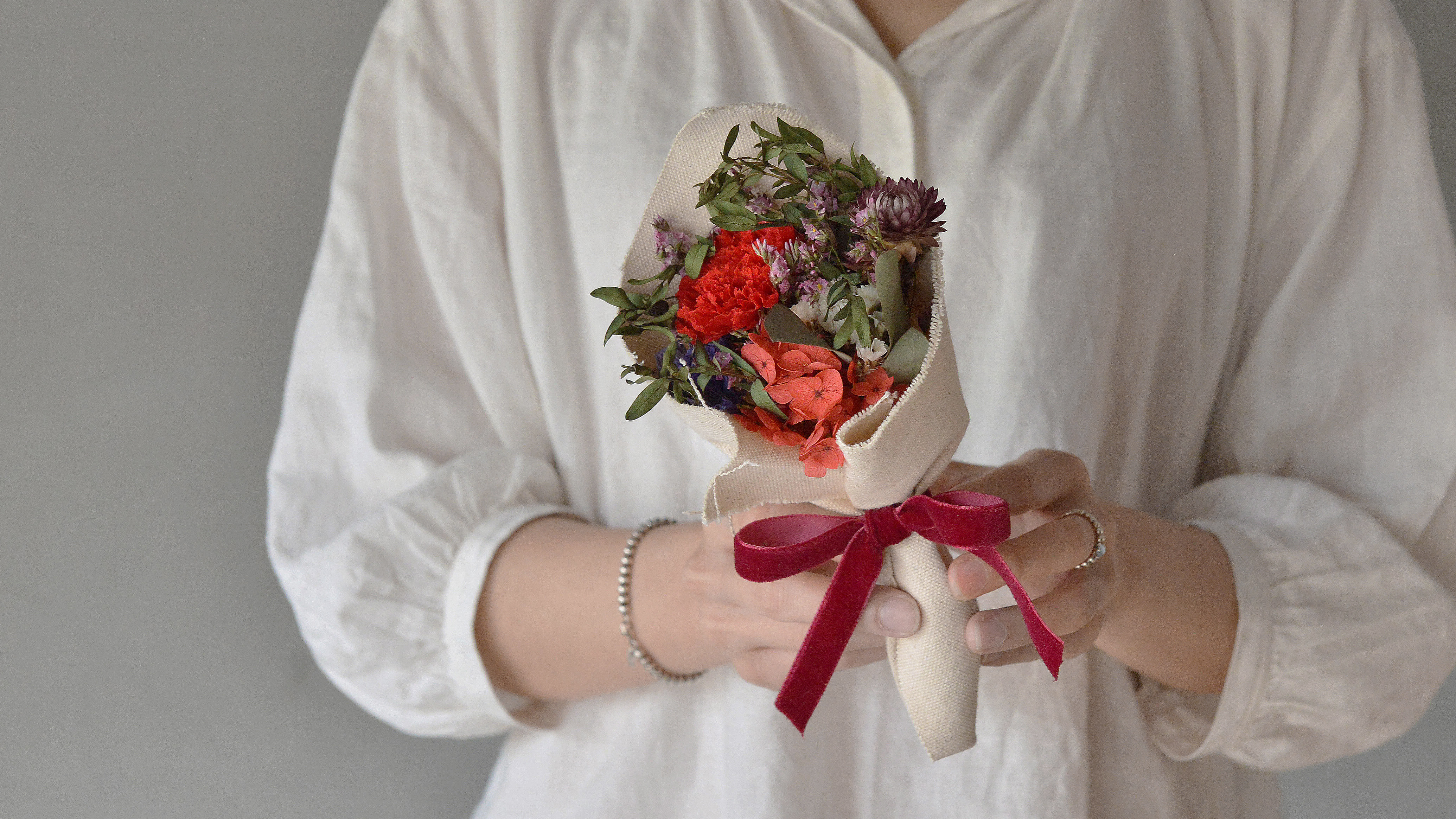 花束除了紙張包裝外,還能使用布品來包裝,尤其以乾燥花來說,存放時間兩年以上,布品能長時間保存。