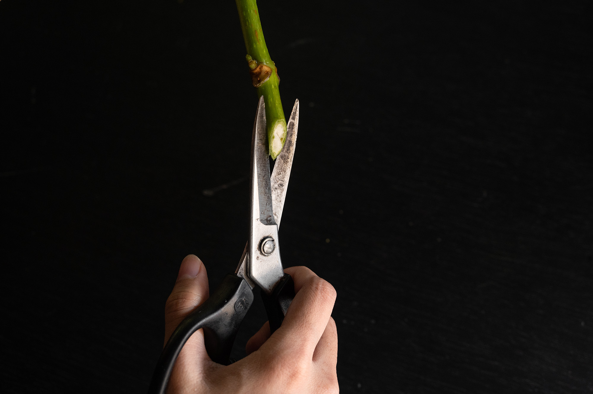・用乾淨、鋒利的剪刀,以 45 度角修剪花腳