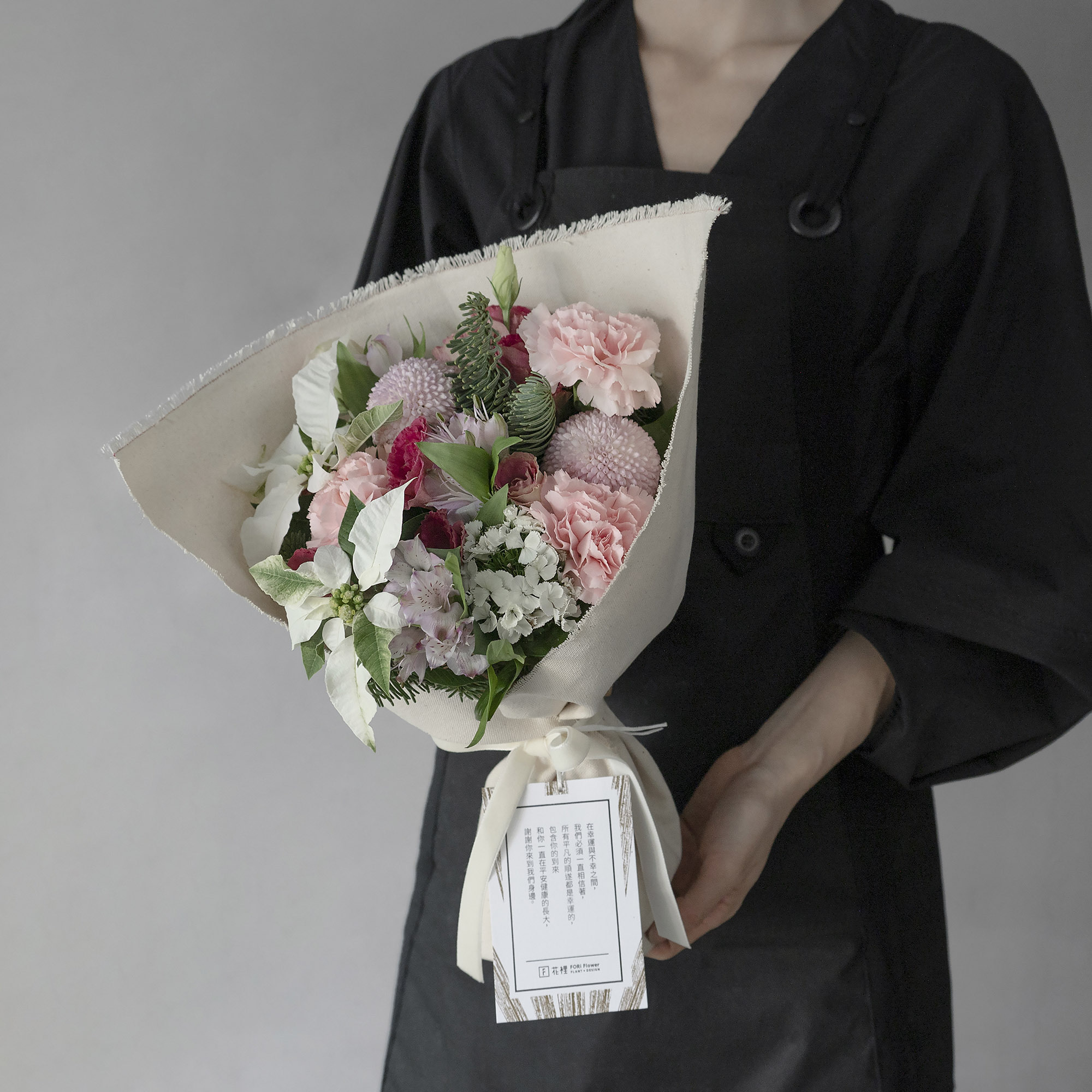諾貝松、白色聖誕紅,都是一年中只有聖誕佳節才會出現的葉材,這是媽媽跟孩子一起度過的第一個聖誕節。