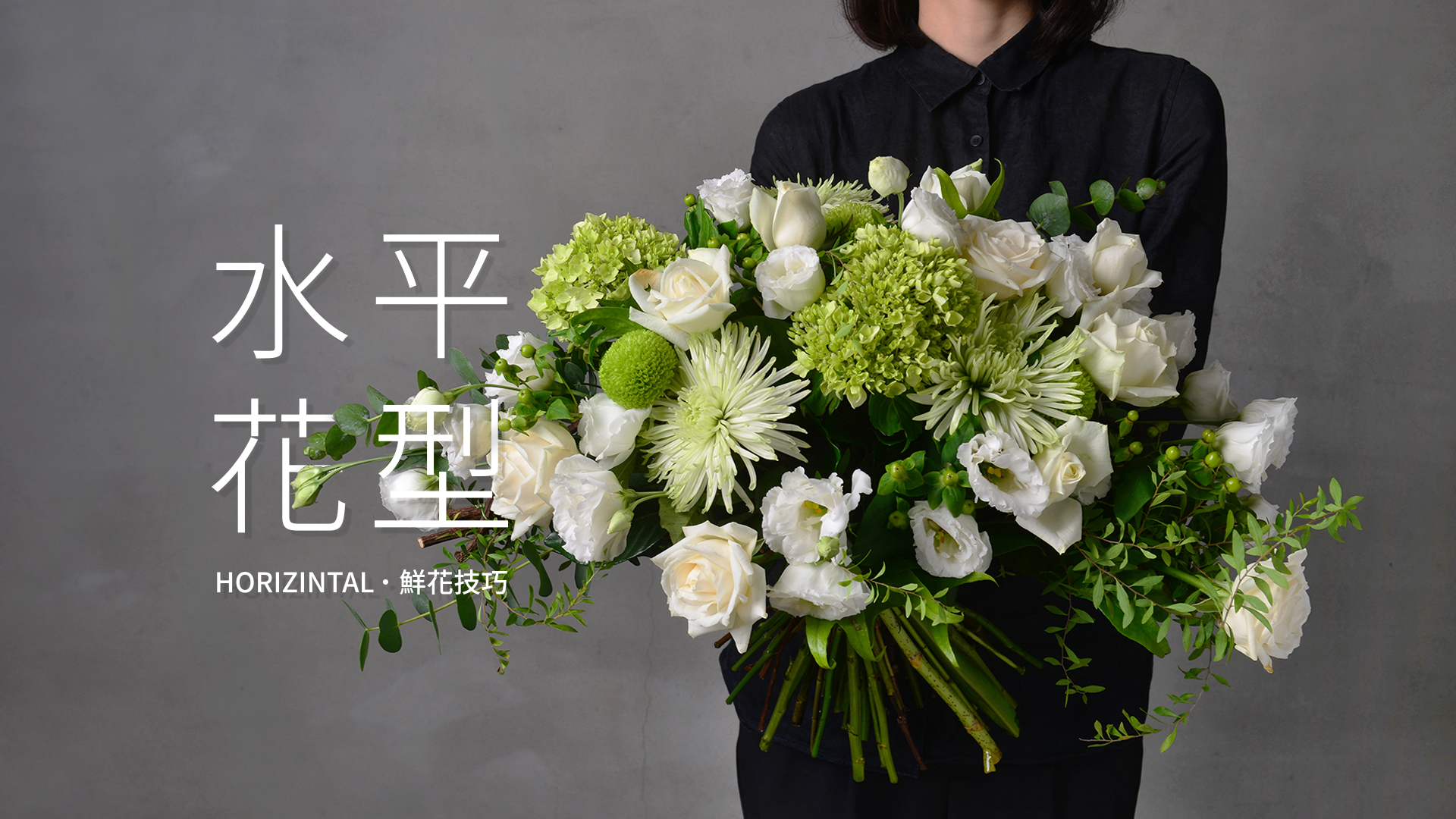 此花型注重於兩側的延伸,秘訣在於捧花內的木藤架構,作用就像建築物中的梁柱,穩穩支撐捧花的水平重量,運用測量技巧來拿捏比例,學習親手編製架構,打造氣勢十足的水平捧花。