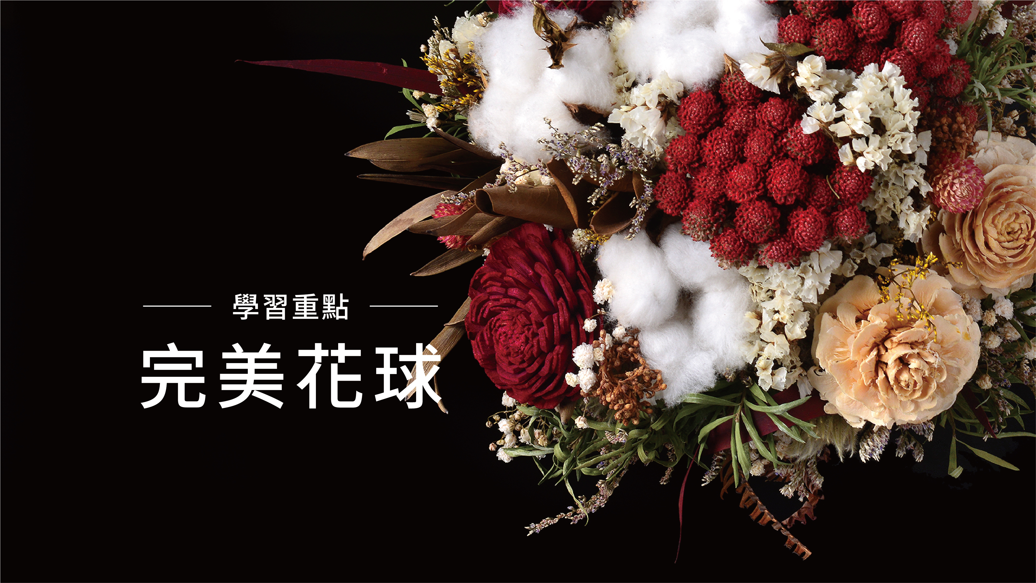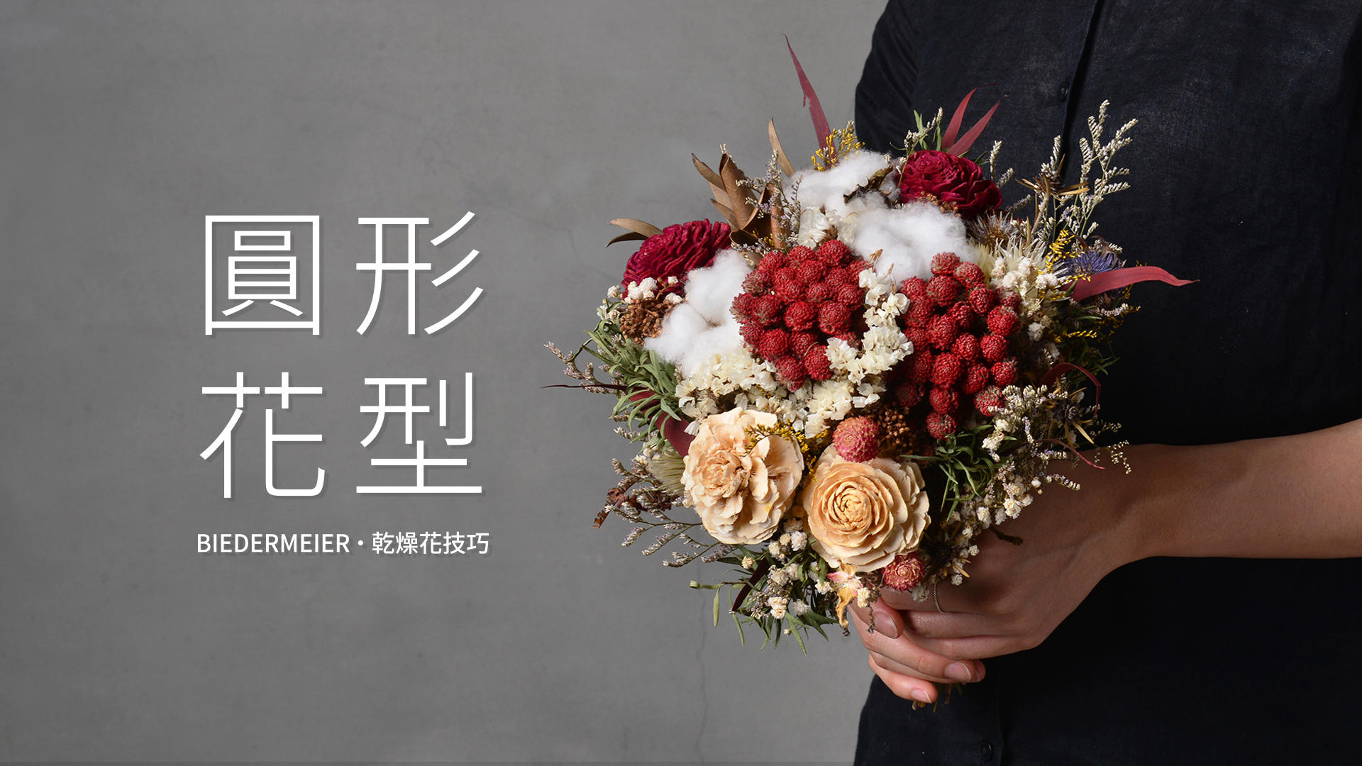 如果提到歷史悠久且經典的花藝,一定不會錯過「畢德麥亞」花型,花一朵接著一朵構成一個完美的球體,乾燥花來製作與鮮花極為不同,花材需要經過細膩的接枝,另外如何選擇合適的花材更為重要,都是構成美麗作品不可缺少的重要條件。