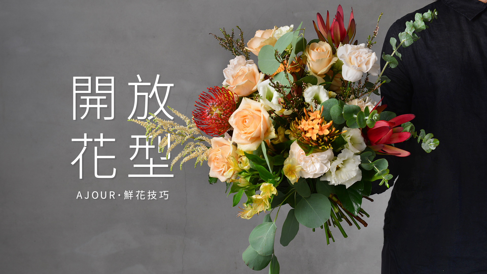 開放花型為捧花的基礎型,跳動的枝葉表現歐式的自然風情,時常為婚紗攝影的首選,也是現今捧花的主流花型,造就多層次感的功夫在於「螺旋花腳」,將枝幹整齊的向中心圍繞,達成跳躍感的花材展開。